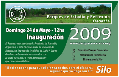 Confirmado: Silo, fundador de la corriente del Humanismo Universalista o «Nuevo Humanismo», orientador del Movimiento Humanista Internacional, y referente de numerosos pensadores, científicos, artistas y gobernantes, viene a la inauguración del parque el 24 de Mayo con disposición para conversar con todos.