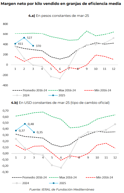 Según los modelos económicos elaborados por el IERAl, los márgenes de una granja de eficiencia media promediaron $411, $527 y $370 por kilo vendido en enero, febrero y marzo de este año, ubicándose un 15%, 67% y 25% por encima de los márgenes promedio 2016-23 para estos mismos meses, respectivamente (en pesos constantes, ajustados por inflación a marzo 2025).